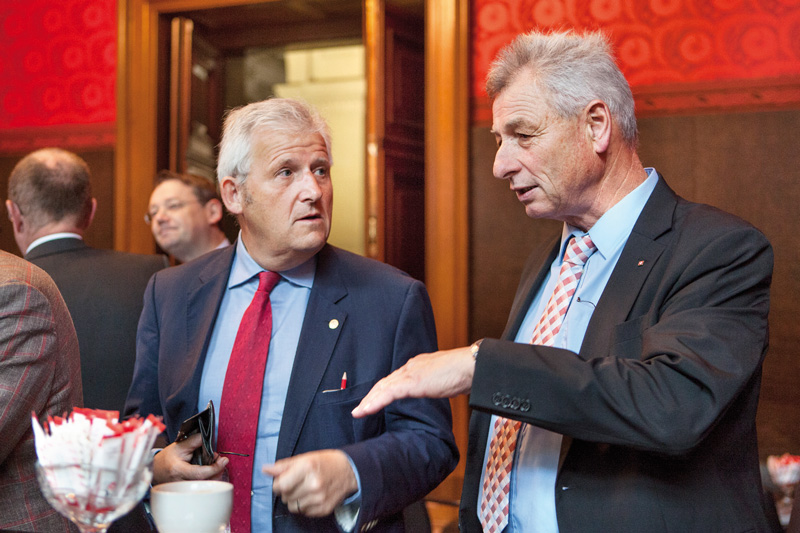 A l’heure du café, Jean-Pierre Grin en pleine discussion au sujet de l’Arc jurassien avec Hans Stöckli, conseiller aux Etats socialiste bernois et emblématique maire de Bienne de 1990 à 2010.