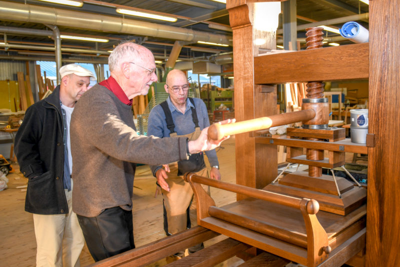 La nouvelle presse de Pierre-Yves Schenker est une réplique d’une machine une fois et demie plus grande, pesant 400 kg et mesurant 3 m de haut sur 1,5 m de large et 4 m de long. L’ébéniste a conçu ce prototype à l’occasion des 500 ans de la Réforme, en 2017. Pièce maîtresse du Musée international de la Réforme, à Genève, elle a ensuite fait sensation en Allemagne, à Zurich, à Saint-Gall et lors des 50 ans de la Déclaration universelle des droits de l’Homme. L’artisan espère que sa «petite» presse voyagera dans les écoles. C.Md