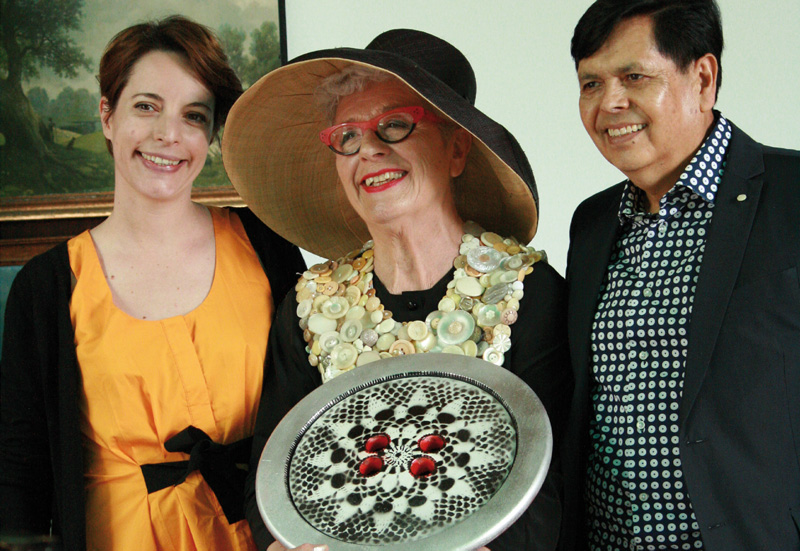 Nicola Beaupain (au centre), fondatrice du Musée du Bouton, remet sa collection à Anna-Lina Corda et Antonio Villaverde, respectivement directrice et conservateur du Musée suisse de la mode.