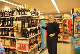 Le gérant du commerce, André Favre, montre le rayon où les bouteilles de spiritueux ont été prises lors du second vol, à l’étalage celui-là.