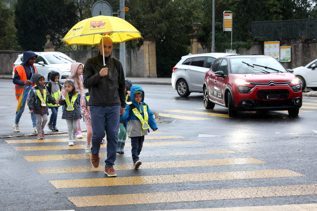Quelques minutes à peine après le départ, l’averse éclate. Célia Kamber ouvre son parapluie jaune poussin à l’effigie du Pedibus. «Les points importants, ce sont la sécurité et la visibilité des enfants», explique l’Yverdonnoise. Cette maman fait partie de la ligne depuis sa création, il y a environ deux ans, aux côtés de sa voisine. Maintenant responsable de la ligne officialisée il y a un an, elle gère le planning des conducteurs. Deux enfants au début, puis cinq, puis huit: la ligne a grandi au fil du temps et a permis d’assurer un roulement sur la totalité des trajets. «C’est bien de pouvoir s’entraider dans un monde de plus en plus individualiste, de pouvoir compter les uns sur les autres», confie-t-elle.