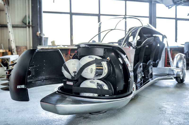 Ouvert, le carénage laisse découvrir qu’il reste encore de l’espace disponible pour y placer les trois casques de protection des passagers.