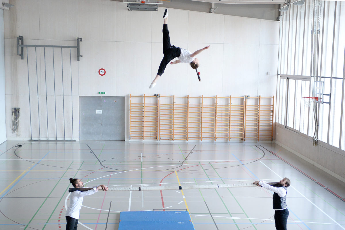 Marc le bourdon et Timothé sont les porteurs, Corinne est acrobate. Elle effectue d’incroyables figures sur une poutre russe. Il s’agit d’une barre plate relativement souple, d’environ 10 cm de large, sur laquelle elle prend appui pour effectuer des saltos, des sauts périlleux, de multiples figures acrobatiques, en prenant élan sur la poutre. «Nous sommes arrivés ici le 10 janvier et avons travaillé une semaine à la création elle-même avec notre directrice artistique, Christine Rossignol, et notre coach technique Joël Sutty. Chaque jour, nous nous entraînions en plus du travail de création. Puis, nous avons commencé les répétitions pures. Notre numéro dure 6 minutes.»