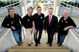 Nicolas Richard, entraîneur de l’équipe féminine de l’UCY, Michel Ruchat, coordinateur du Challenge des Bains, Simon Stucki, star de la discipline en Suisse alémanique, Boris Dumont, responsable marketing et ventes du Centre thermal, et Jean-Pierre Pozzi, président de l’UCY.