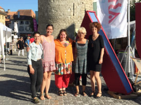 Cinzia Sigg (à g.) et Sandrine Rollinet (à dr.), de l’association Héros ordinaires, entourent Marylène Grzesiak, Erel Zannou et Sylvie Thonney, trois héroïnes qui figurent dans leur court-métrage projeté à l’Aula Magna samedi soir. ©Valérie Beauverd