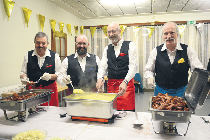 Habillés de leur beau tablier, Gabriel Caillet, Albert Graf,Ernest Reumer et Dominique Garratti (de g. à dr.) ont servi leur menu traditionnel, à savoir du papet vaudois sur un lit de cornettes.