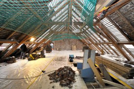 Une succession de couches superposées qui place les collaborateurs du chantier devant un dilemme : «Faut-il garder la dernière ou une, plus ancienne, de l’intérieur ? Beaucoup de choses se décident sur place », souligne l’architecte. Dans la majorité des cas, les intervenants cherchent à trouver un compromis entre la préservation de composantes historiques et l’adaptation du site aux exigences contemporaines, à l’image des poutres du Xve siècle, dont une partie sera coupée pour l’ascenseur. Les deux derniers niveaux concentrent le gros de l’activité ouvrière. Au niveau quatre, qui représente, avec l’étage inférieur, la surface de 600m2 gagnée pour la mise en place d’expositions temporaires, des travailleurs entreprennent de fixer des vis dans le but de lier les poutres aux solives, alors que, sous les combles, d’autres employés dégagent le toit de ses tuiles. Cet espace permettra, nouvelle plus-value, de suivre le chemin de ronde tout autour du Château.
