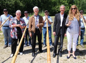 Pierrette Roulet-Grin, vice-présidente de l’association Trivapor, Guy Quenot, qui quitte le comité, François Kistler, président, et Carole Zamora, syndique de Concise (de g. à dr.), devant les joueurs de cor des Alpes de La Béroche.