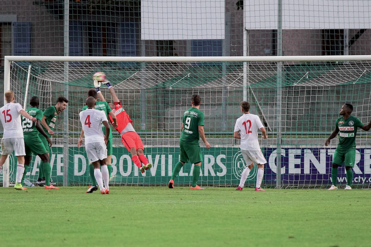 Aie ! Yverdon Sport encaisse l’égalisation dans les dernières secondes des arrêts de jeu. Le corner direct de Claudio Bernini trompe la vigilance du gardien Ludovic Zwahlen.